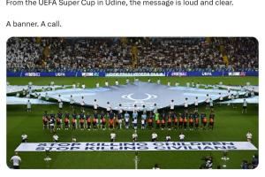 欧足联官方在社交平台上配文写道:“来自乌迪内的欧洲超级杯现场,这则信息响亮且清晰,一面标语,一次号召。”这一标语并没有明确针对的对象,但欧足联在活动期间还邀请了两名来自巴勒斯坦的难民儿童参加颁奖仪式,指向性十分明确。