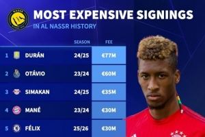 利雅得胜利最贵引援榜:杜兰7700万欧居首,科曼2500万欧并列第7
