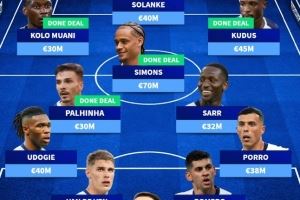 中场:帕利尼亚(3000万)、哈维-西蒙斯(7000万)、帕佩-萨尔(3200万)
