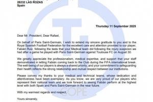 “我们非常感谢贵方团队在国际比赛日期间,让法比安顺利返回俱乐部所展现出的专业精神、医学专长以及大力支持。球员的健康始终是我们共同的优先事项,贵方在保障球员健康方面所做出的承诺,也体现了我们两家机构之间牢固的合作关系与相互尊重。”